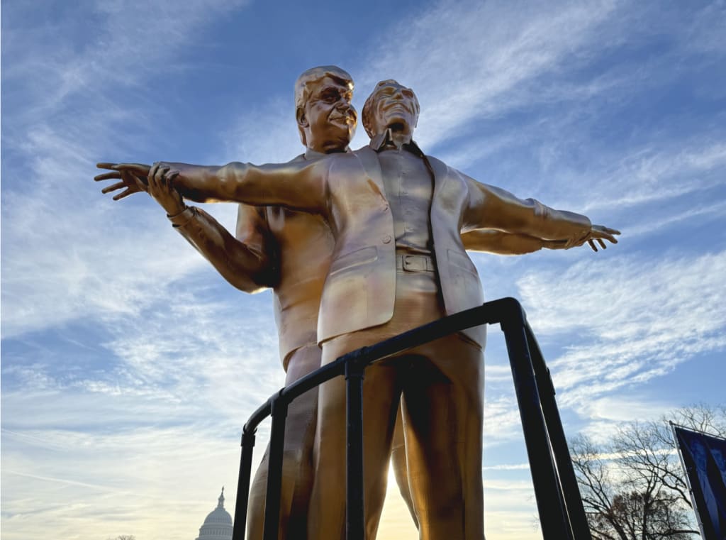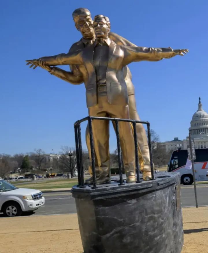 This is not the first TSH art piece designed to attract attention to Trump-Epstein connections. Earlier last year they installed another statue at the same place: Best Friends Forever. That one stirred up a lot of discussion as well, and even though it was supposed to stand there longer, it was broken down by the US Park Police later the same day. TSH made a campaign out of that as well, well described in this article by an anthropology professor.