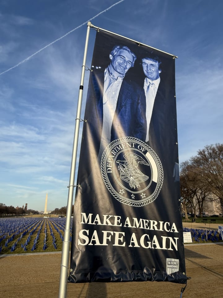 On March 12, 2026 they installed a new Titanic-themed Trump-Epstein statue on the National Mall, accompanied by the banners that clearly satirize Trump's banner on the DOJ, USDA and other federal buildings. Except that this banner features one of the most famous photos of Trump and Epstein together with "Make America Safe Again" as the accompanying text and the DOJ modified seal with the word "Justice" redacted in it.