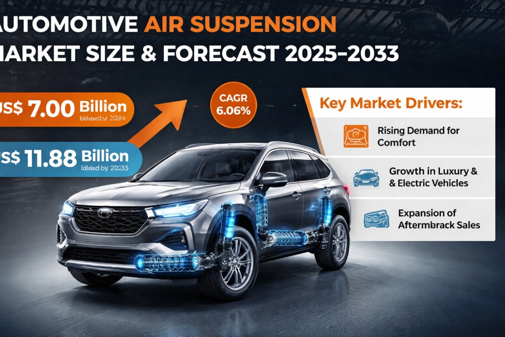 The global automotive industry is undergoing rapid transformation as consumers increasingly demand better ride comfort, enhanced vehicle handling, and advanced driving experiences. Among the technologies reshaping modern vehicles, air suspension systems have emerged as a significant innovation. According to Renub Research, the global Automotive Air Suspension Market is projected to reach approximately US$ 11.88 billion by 2033, growing from around US$ 7.00 billion in 2024, at a compound annual growth rate (CAGR) of 6.06% during 2025–2033.
