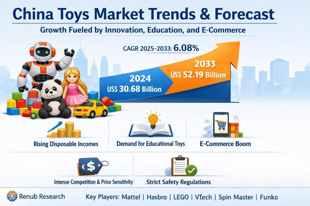 China’s toy industry is entering an exciting phase of expansion, driven by rising disposable incomes, evolving consumer preferences, and the rapid integration of technology into playtime experiences. According to market insights from Renub Research, the China Toys Market is projected to grow from US$ 30.68 billion in 2024 to US$ 52.19 billion by 2033, registering a compound annual growth rate (CAGR) of 6.08% between 2025 and 2033.