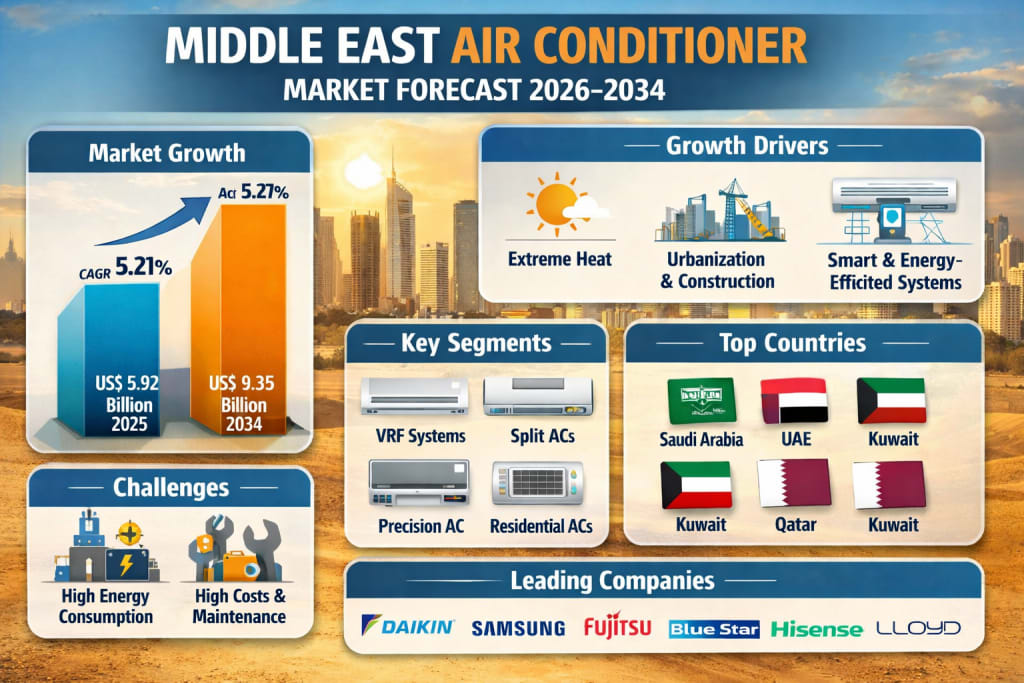 The Middle East air conditioner market is poised for steady growth over the coming decade, fueled by rising temperatures, expanding urban infrastructure, and the increasing adoption of energy-efficient cooling technologies. According to Renub Research, the Middle East Air Conditioner Market is projected to grow from US$ 5.92 Billion in 2025 to US$ 9.35 Billion by 2034, registering a compound annual growth rate (CAGR) of 5.21% from 2026 to 2034.