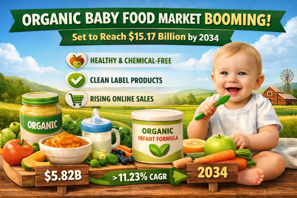 According to Renub Research, the global organic baby food market was valued at US$ 5.82 Billion in 2025 and is projected to reach US$ 15.17 Billion by 2034, expanding at a CAGR of 11.23% during the forecast period from 2026 to 2034. The rapid growth reflects the increasing demand for organic and natural products designed specifically for infants and toddlers.